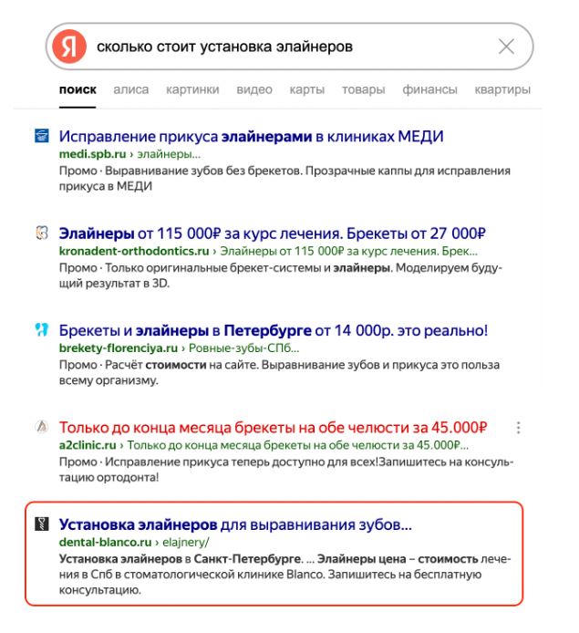 4. Вывели сайт в ТОП-10 Яндекса по «элайнерам» и «винирам»