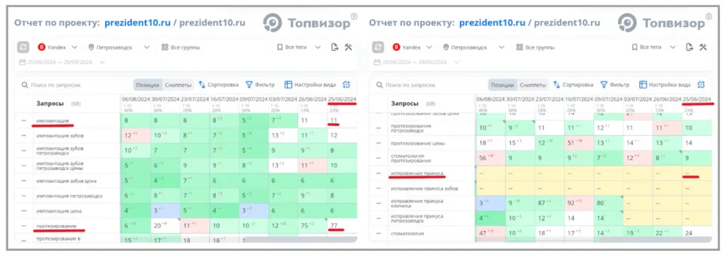 - Сайт, который мы оперативно доработали за предыдущим подрядчиком и проводили SEO-оптимизацию, находится в топ-10 по ключевым запросам: имплантация, протезирование, исправление прикуса.