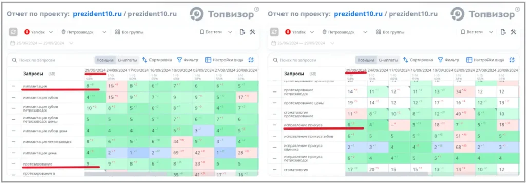 Позиции сайта по ключевым запросам через 3 месяца, в сентябре 2024 года