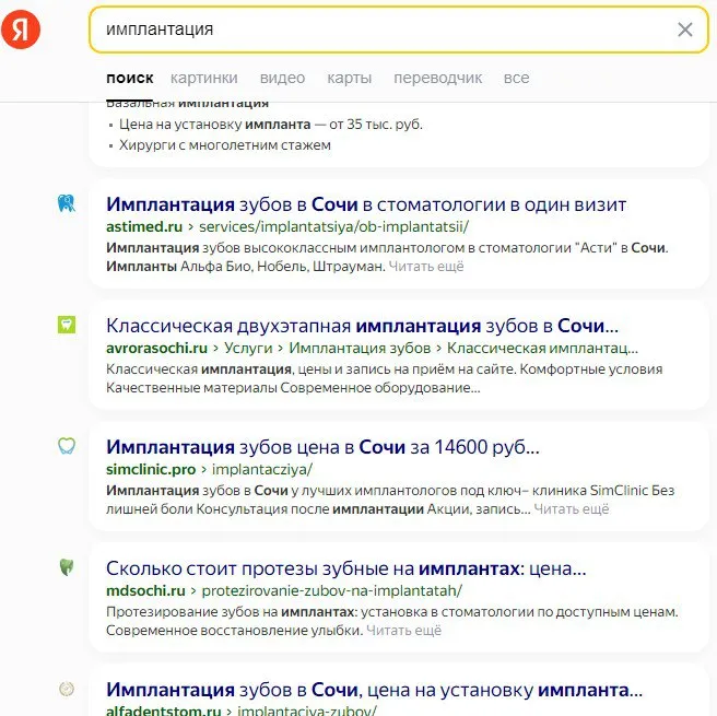 3. В течение двух месяцев полностью переупаковали сайт. За счет seo-оптимизации по запросам «стоматология» и «имплантация» вывели его на первую страницу поисковой выдачи Яндекса без использования контекстной рекламы.