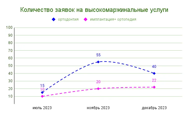 Совместно сформулировали первоначальную цель — увеличить общее количество обращений в клинику и в том числе в два раза увеличить спрос на высокомаржинальные услуги: имплантацию, ортопедию, ортодонтию.