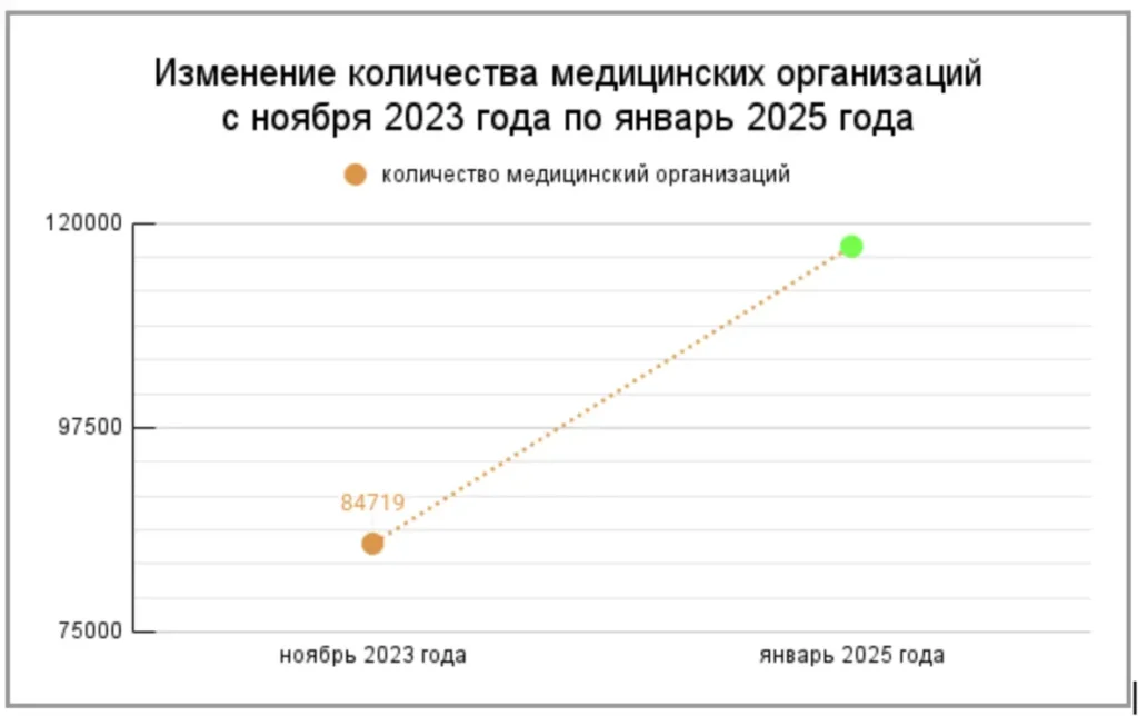 На 38,6 % за 14 месяцев увеличилось в России количество медицинских организаций, работающих по лицензии. В ноябре 2023 года их было 84 719, а в январе 2025, по данным портала statprivat.ru, их стало 117 474. То есть каждый месяц открывалось примерно 2 340 клиник.