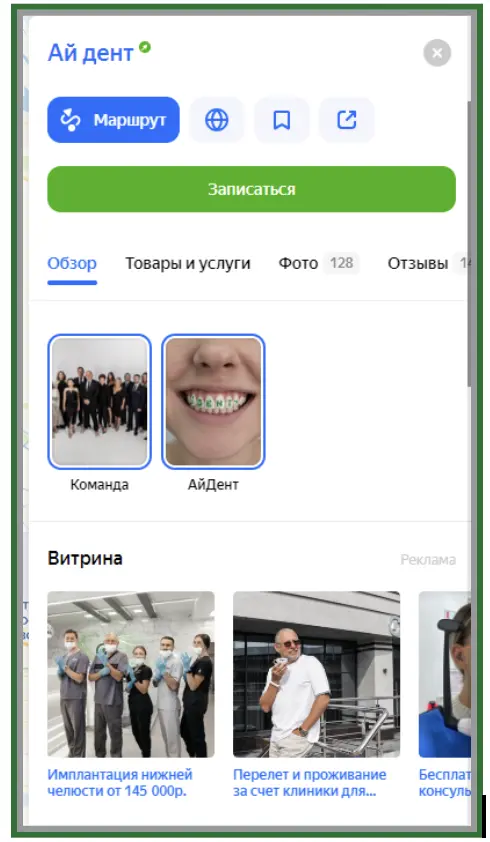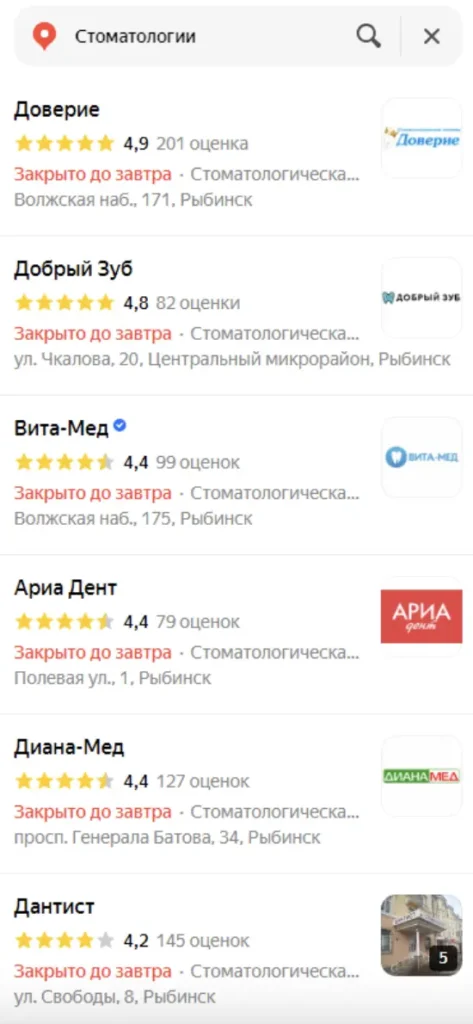 Актуальная информация в карточке об адресе, часах работы, ценах и услугах значительно увеличивает шансы на привлечение пациентов. Это позволяет существенно повысить количество записей на прием и улучшить общие финансовые показатели.