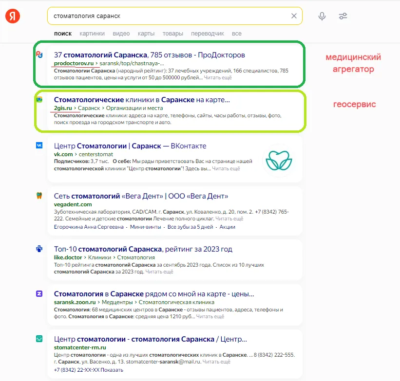 По запросу «стоматология саранск» на верхних строчках поисковой выдачи находятся prodoctorov.ru и 2gis.ru. И это не контекстная реклама