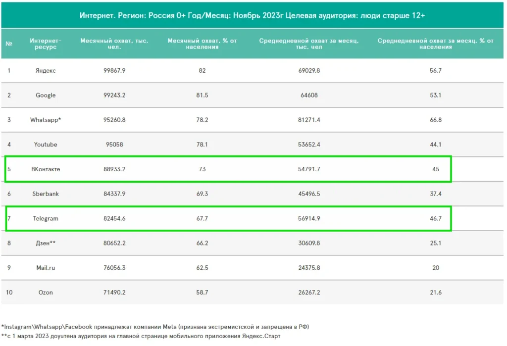 Соцсеть и мессенджер Павла Дурова продолжат расти, и трафик оттуда — тоже. По состоянию на ноябрь 2023 года, аудитория «ВКонтакте» составила 88,9 млн пользователей. В Telegram в ноябре заходили 82,4 млн человек.
