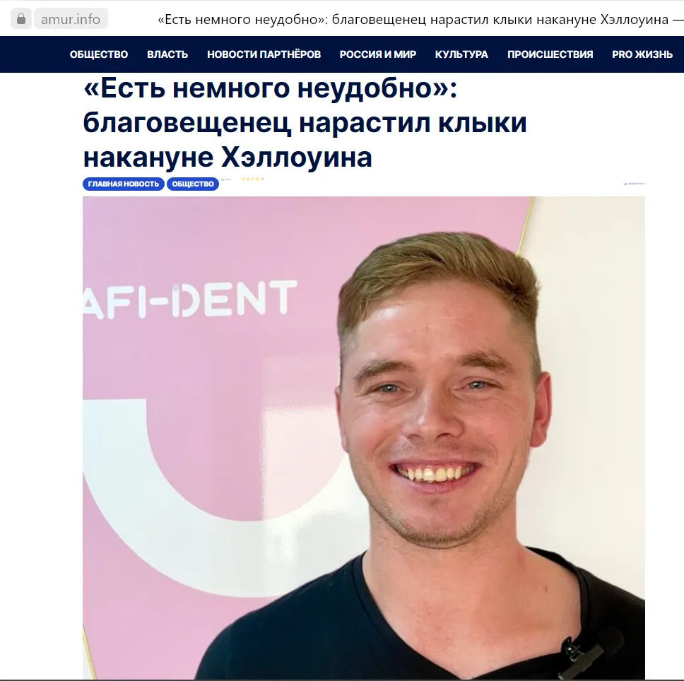 Осенью 2023 года стоматологической клинике AFIDENT мы предложили необычную акцию в преддверии Хэллоуина: идея заключалась в том, что в клинику обратился пациент, чтобы нарастить клыки.   После выхода поста об этом в соцсетях клиники информацию опубликовали на региональном сайте. Таким образом мы получили больше охватов, большую узнаваемость в городе.
